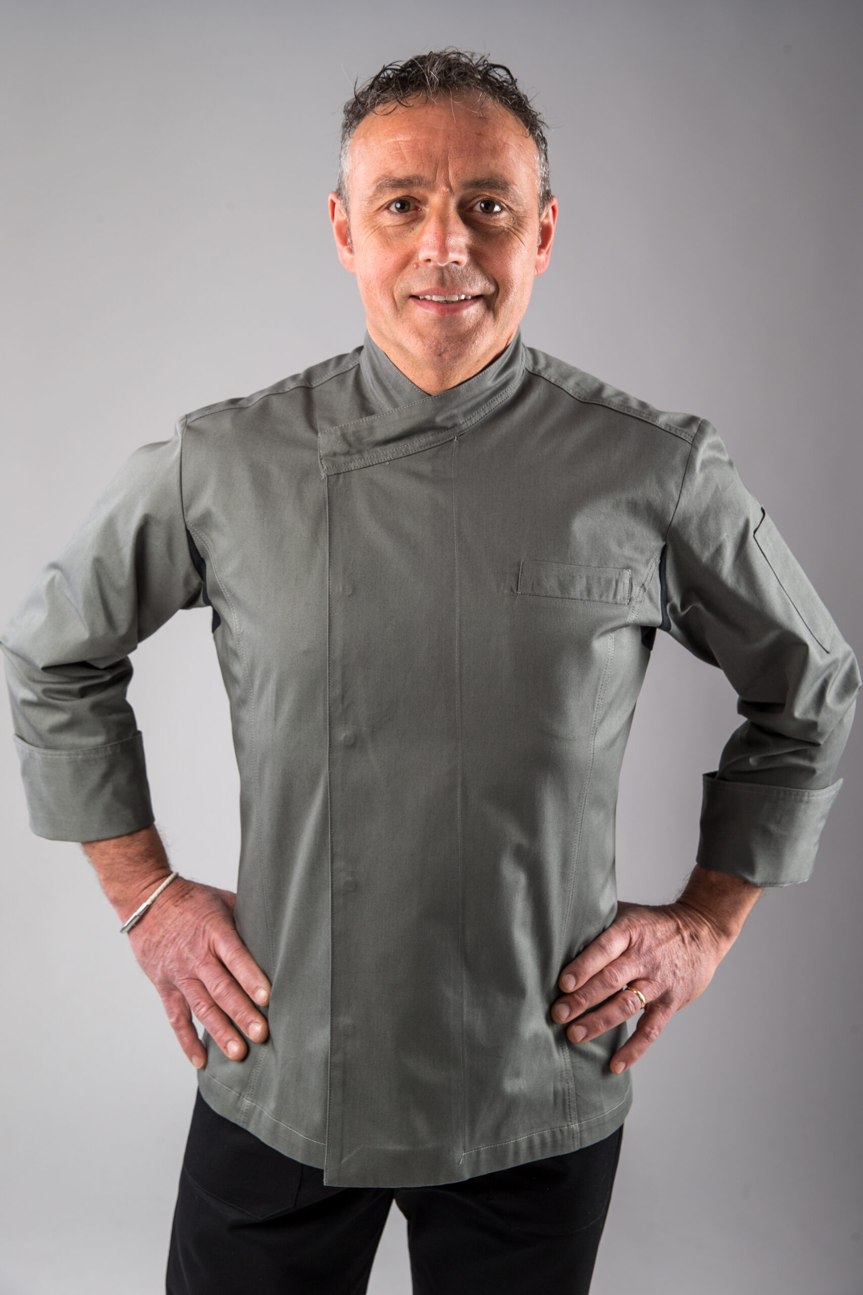 Giacca asimmetrica, bottoni automatici nascosti internamente, taschino applicato sul petto e sulla manica sinistra. Il modello è disponibile in due versioni di tessuto: Indanthrene puro cotone drill (nero o grigio); misto poliestere/cotone (bianco).