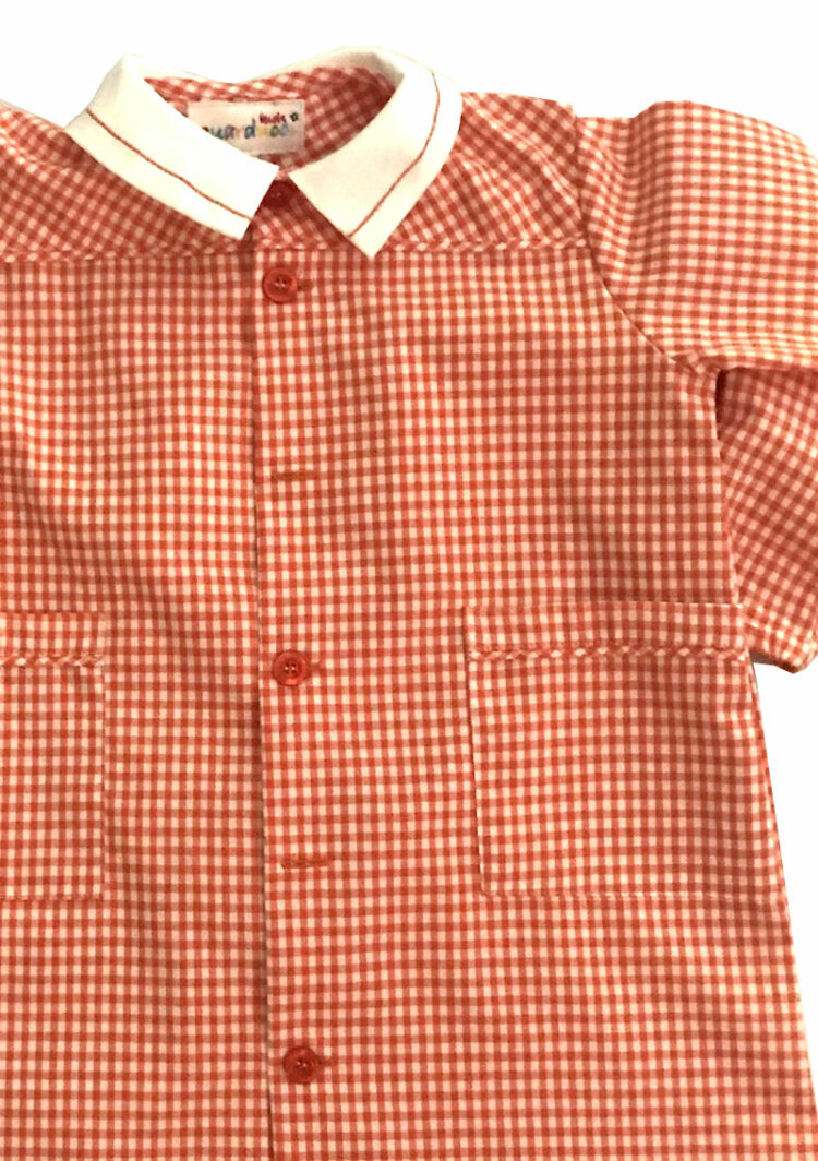 Grembiule in quadretto Vichy, maniche lunghe con elastico ai polsi, in Zephir di puro cotone 100% prodotto e tinto in Italia.