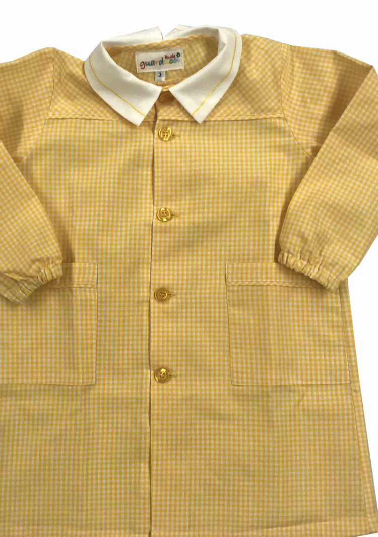 Grembiule per la scuola con taglio ampio, in quadretto Vichy, maniche lunghe con pratico elastico ai polsi. Facile da indossare e da lavare. Disponibile in vari colori e taglie, è dotato di resistente allacciatura con bottoni, collettino bianco con ricamo in tinta al quadretto, due tasche rettangolari con profilo per contenere piccoli oggetti.