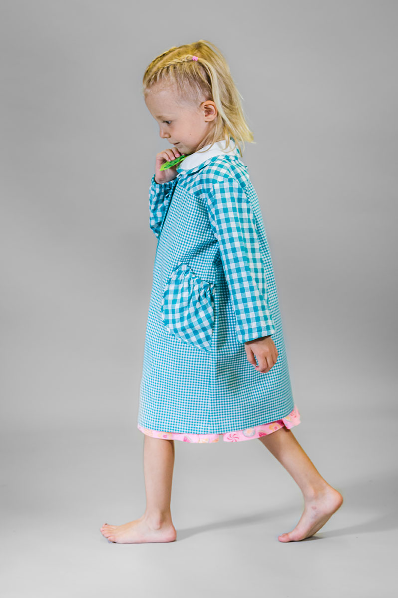 Un gioco di quadretti tinta su tinta per questo grembiule pensato per la Scuola Materna e Asilo. Il classico quadretto Vichy per maniche, carré e tasche, il corpetto in contrasto con in quadretti piccolini. Il colletto rotondo alla bebè in puro cotone bianco candido bordato profilato in sbieco. Pratici bottoni ed confortevoli elastici ai polsi. Alta vestibilità e traspirabilità. Due sfiziose tasche arricciate applicate.
