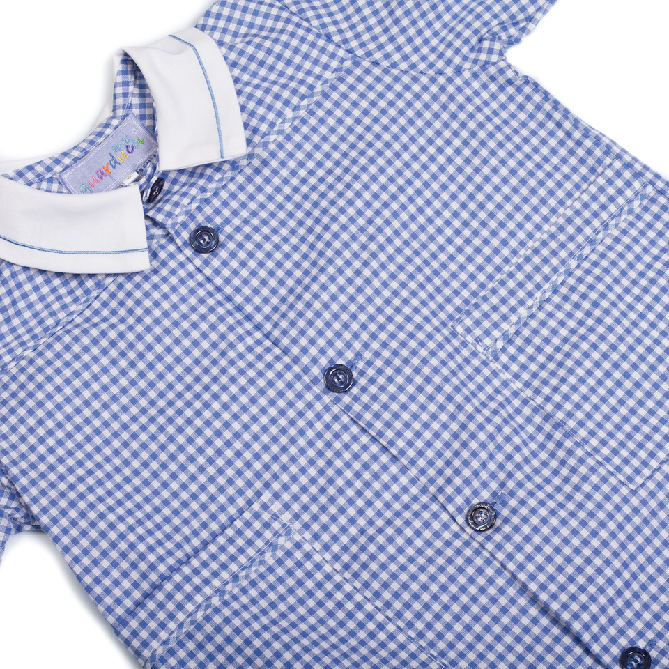 Grembiule per la scuola con taglio ampio, in quadretto Vichy, maniche lunghe con pratico elastico ai polsi. Facile da indossare e da lavare. Disponibile in vari colori e taglie, è dotato di resistente allacciatura con bottoni, collettino bianco con ricamo in tinta al quadretto, due tasche rettangolari con profilo per contenere piccoli oggetti.